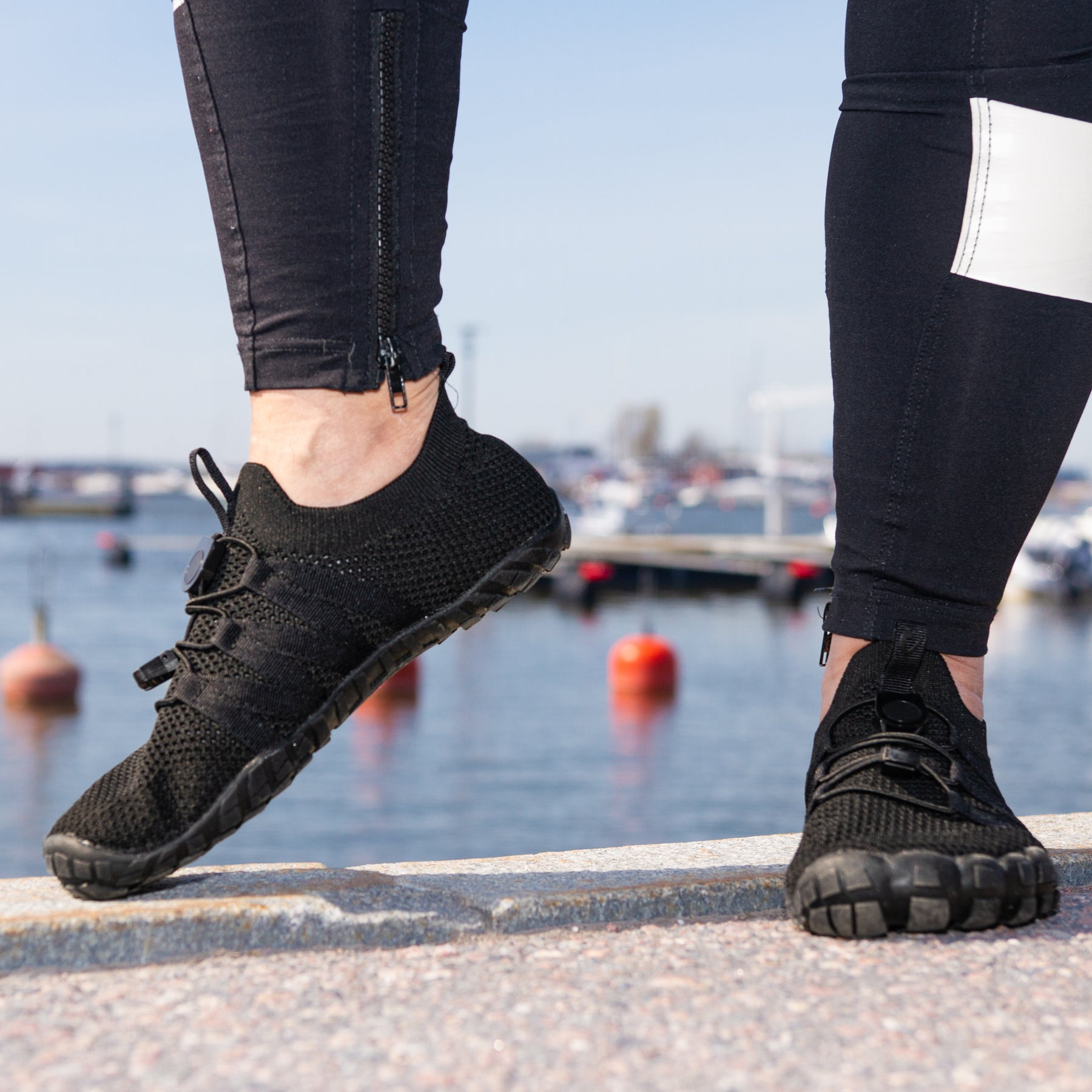vapauta varpaat paljasjalkakengat raparperi käyttokuva kesä istuen puisella terassilla mustat housut